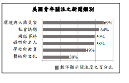 The table shows the level of attention paid to different news categories by American young people aged 18 to 29. Among the six categories, "environment and natural disasters" has the highest attention rate—nearly 65% of the youth care about it. In contrast, "arts and culture" has the lowest attention, with only around 20% showing interest. Other categories fall in between: "health and fitness" and "technology" are moderately concerned, each with about 50% attention, while "education and schools" and "politics" are less popular, with attention rates of roughly 30% and 25% respectively.