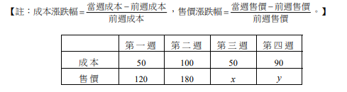 第三週成本跌50%,售價跌25%:\( x = 180 \times (1 - 0.25) = 135 \)。第四週成本漲80%,售價漲40%:\( y = 135 \times (1 + 0.4) = 189 \)。故 \( 120 \lt x \lt 180 \lt y \)。答案:(5) 報錯