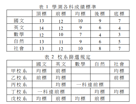 某年學科能力測驗小華的成績為:國文11級分、英文12級分、數學9級分、自然9級分、社會12級分。他考慮申請一些校系,表1為大考中心公布的學測各科成績標準;表2是他最有興趣的五個校系規定的申請檢定標準,依規定申請者需通過該校系所有檢定標準才會被列入篩選。例如甲校系規定國文成績須達均標、英文須達前標、且社會須達均標;丙校系則規定英文成績須達均標、且數學或自然至少有一科達前標。表2空白者表示該校系對該科成績未規定檢定標準。