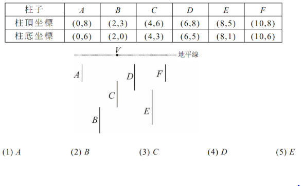 某人使用單點透視法,以地平線上一點為消失點,將地平面上的六根鉛直柱子\(A\),\(B\),\(C\),\(D\),\(E\),\(F\)畫在坐標平面上,各柱柱頂與柱底的坐標如下表,並且讓點\(V(4,9)\)代表消失點,如圖所示。因圖形中\(A\)、\(F\)兩柱的柱底連線與柱頂連線均平行於地平線,故\(A\)、\(F\)兩柱的實際高度相等。根據上述,試選出實際高度最大的柱子。