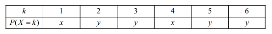 設隨機變數X表示投擲一不公正骰子出現的點數,\(P(X=k)\)表示隨機變數X取值為k的機率。已知X的機率分布如下表:(\(x,y\)為未知常數)又知X的期望值等於3。