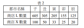 表2是某假想國家前五大都市的連鎖商店數量。其中商店L的展店標準為:「每個都市至少5間,每5000人再增加一間」,商店X的展店標準為:「每30000人展店一間」。請問: