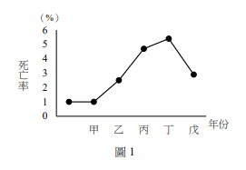 圖1是依據二十世紀某一時期四川省官方資料繪製的人口死亡率變化圖。圖中縱軸為死亡率(%),橫軸為年份。從圖中甲年到戊年的變化判斷,這種情況主要是發生在:(依當時官方推估,死亡率正常值是1%)
