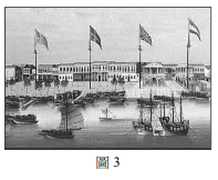 圖3描繪十八世紀末亞洲某港口的景象。該國政府鑑於外商日多,就在海口劃一特區,由外商依國籍設立貨棧,懸掛國旗標示。圖中,外商由左至右分別是美國、瑞典、英國與荷蘭。外商每年只能停留七個月,每月進城次數也有限制,與政府交涉須透過本地商人中介。29. 圖中的港口最可能是: