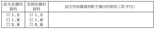 依據圖5,該生與老師最可能分別依據哪些資料?與老師依據的資料相較,該生依據的資料不適合之原因為何?請在答題卷表格中的左欄勾選該生所依據的資料,於中欄勾選老師所依據的資料,最後在右欄說明該生所依據的資料較不適合之原因。(6分;右欄25字內;左欄和中欄任一欄未勾選或勾選錯誤,則右欄不給分)