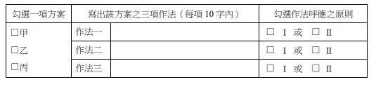 根據題文,市政府採用的方案應為何者?該方案的作法及其分別呼應的共融模式原則為何?請在答題卷表格左欄先勾選一項方案;其次,依據題文於中欄寫出該方案的三項作法,並在右欄勾選每項作法呼應的原則。(5分;左欄未勾選或勾選錯誤,則本題不計分)