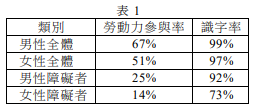 小亞為撰寫障礙者社會處境的探究學習報告,蒐集表1的數據。依據表1,以下敘述何者最適合解釋女性障礙者的社會處境?