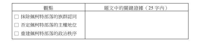 【題組47-49】北美的原住民過往曾遭遇北美殖民者的屠殺和迫害。例如:英國殖民者曾與原住民佩柯特人簽訂條約,稱呼部落首長為國王;雙方交戰時遵循國與國家戰規則,不得攻擊對方平民。後來英軍卻突然攻擊佩柯特部落,屠殺眾多平民,後續又有不少平民被賣為奴隸,佩柯特人從此無法再起。由於當時歐洲國家掃蕩叛亂者時被允許屠殺平民,英軍看來推翻了過去和佩柯特人的交戰規則,將佩柯特人視為叛亂者。晚近,美國某大學的原住民族學生積極在校園內建立原住民族社群、舉辦原住民族週活動。一位參與的原住民學生表示:我們在校園中非常辛苦,主流社會否定我們的存在,看不見我們。我們需要一個能看見彼此、相互共鳴的原住民族社群,一起打造美好未來。請問:依據題文,英軍對佩柯特平民從不攻擊轉為屠殺,下列哪項解釋觀點最能說明其立場變化?請先左右欄勾選觀點,並左右欄寫出題文中的關鍵證據。