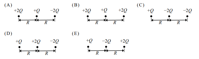 計算左端電荷受力。選項(A):左端+2Q受中+Q斥力\(k(2Q)(Q)/R^2\)向右,受右-2Q引力\(k(2Q)(2Q)/(2R)^2 = k(4Q^2)/(4R^2)=kQ^2/R^2\)向左,合力為\(2kQ^2/R^2 - kQ^2/R^2 = kQ^2/R^2\)向右。