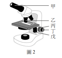 進行「細胞形態的觀察」探討活動時,若將顯微鏡鏡頭對準觀測物後,視野中仍一片空白,應先調整圖2 顯微鏡的何處才有助於看見觀測物?