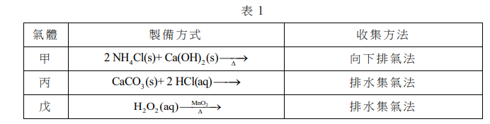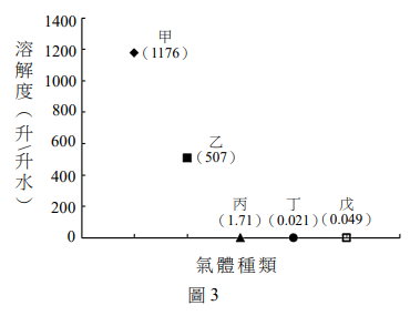 在0℃時,有五種不同的氣體、氦化氫、氰、二氧化碳、氫、小華測量其在水中的溶解度的情況,得到圖3中甲、乙、丙、丁、戊五種不同的數值(括弧裡數值為溶解度)。為進一步確認此五種氣體,老師告知小華甲、丙、戊三種氣體的製備與收集的方法,如表1所示。