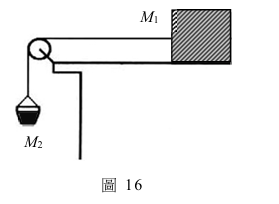 如圖16所示,吊桶以長度不變的細繩繞過光滑定滑輪,連接到水平桌面上質量為 \( M_1 \) 的木塊。今緩慢將微量細砂加入吊桶,直到吊桶與細砂的總質量為 \( M_2 \)、木塊開始滑動為止。已知木塊水平移動且不轉動,受到的動摩擦力量值固定為 \( f \),重力加速度量值為 \( g \),且繩上各點的張力短沿著繩子方向作用,量值均為 \( T \)。依據上述回答60-61題。
