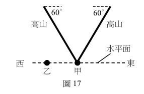62. 如圖17 所示,某生走在南北方向峽谷中的甲點,兩旁高山的山坡約60°向山谷傾斜,在西側山腳有一薄煤層出露,測得煤層傾斜向東、傾角45°、走向為南北(走向是煤層水平延伸的方向)。此區地層層序正常,沒有斷層、褶皺或其他因素干擾,今某生從甲點往西水平挖100 公尺到乙點後仍不見煤層,某生應該在乙點繼續往哪邊挖才能找到煤層?