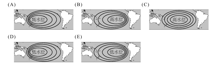 65. 海面高度差異是影響海流流動的主要因素之一,而高度梯度越大,流速越快。受科氏力影響,一般大洋西側的海流流速較快。利用人造衛星對海洋進行雷達測高遙測,可獲知大範圍海域的海面高度變化。下列何者最有可能是人造衛星所獲得的南太平洋海面高度的等高線圖?