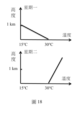 68. 探空氣球的觀測資料,有助於瞭解環境大氣的特徵。若板橋氣象站在某星期一、星期二量測到的大氣溫度隨高度變化垂直分布如圖18所示,且兩天的大氣水氣含量相同,下列哪些敘述正確?(應選2項)