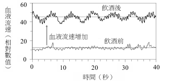 測量血液流速的血流儀是以都卜勒效應為原理製成。若血流儀的感測器以頻率為 f的 聲波或光波入射到血液,而接收到的反射波頻率為( f f ), f 的量值與血液流速可 近似為成正比。圖21為探究飲酒對於血液流速影響的監測數據曲線。