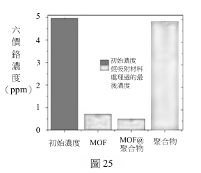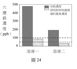 題組(55-57題)將相同重量的MOF材料,放入兩杯體積相同但六價鉻濃度不同的水溶液,靜置30分鐘後,測量水中六價鉻濃度,其結果顯示於圖24。下列敘述,哪些正確?(應選3項)
