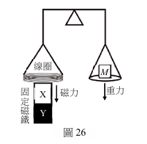 量子科學以光電科技改善了生活,也增進了質量國際標準的精密與穩定。科學家發現 電壓、電阻與電磁波能量等電磁量的量子單元,與普朗克常數$h$相關,因此訂$h=6.62607015\times10^{-34}J\cdot s$為新的質量基準。工程師使用類似於圖26的電磁天平來校準 質量,並利用經過量子單元校正的電磁量,來測量與換算線圈的電壓與電流,藉以連 結質量M與普朗克常數$h$。 某生利用積木製作一座類似於圖26等臂的電磁天平。圖中右側為秤盤,左側為線圈和磁 鐵,X與Y代表固定磁鐵的兩極。以支點為軸,線圈與秤盤可以是維持於水平的靜態模 式,或上下微幅振動的動態模式。