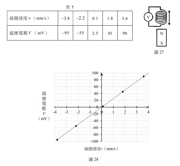 題組(58-60題)靜態模式時,線圈電流$I$與磁鐵之間的作用力量值為$F_B=f_B I$。由於缺乏檢測$f_B$的設備,無法從靜態模式求得待測物的質量$M$。但可知,當線圈相對於磁鐵移動的速度為$v$時,線圈的感應電動勢(電壓)為$V=f_B v$,動態模式與靜態模式的$f_B$相同,示意如圖27。分析線圈速度$v$,以及對應的電壓表讀數$V$,其數據如表5,並繪製感應電壓對線圈速度($V-v$)的關係圖,如圖28所示,藉以推算$f_B$值。當天平達靜態平衡時,線圈電流為$I=40mA$,試以$kg$為單位,計算待測物的質量,須寫出計算步驟,並四捨五入至小數第1位。(已知重力加速度量值$g=9.8m/s^2$)