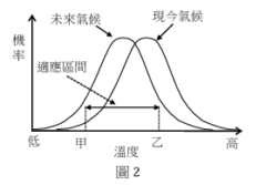 圖 2 代表某星球現今氣候與未來氣候的溫度機率分布,有一種農作物在該星球上可生存的溫度區間為甲至乙,比較該星球現今氣候與未來氣候的溫度機率分布,下列敘述何者錯誤?