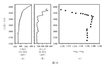 51-54題為題組 自工業革命於 $1760$ 年在英國開始後,人類對於化石燃料(煤和石油)的使用滿足了經濟發展和產業革命的需求,然而這些化石燃料的燃燒,也使空氣中的二氧化碳濃度上升,如圖 15(a) 所示。除了二氧化碳之外,人類對化石燃料的運用也在環境中留下許多痕跡,鉛元素便是其中一個例子。圖 15(b) 是英國某湖泊岩心(岩芯)中 $1700$ 年以來的鉛濃度變化,圖 15(c) 則是 $1700$ 年以來,該岩心中的鉛-$206$ 與鉛-$207$ 的比例($\frac{^{206}\mathrm{Pb}}{^{207}\mathrm{Pb}}$)變化。