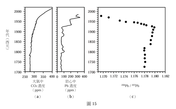 51-54題為題組 自工業革命於 $1760$ 年在英國開始後,人類對於化石燃料(煤和石油)的使用滿足了經濟發展和產業革命的需求,然而這些化石燃料的燃燒,也使空氣中的二氧化碳濃度上升,如圖 15(a) 所示。除了二氧化碳之外,人類對化石燃料的運用也在環境中留下許多痕跡,鉛元素便是其中一個例子。圖 15(b) 是英國某湖泊岩心(岩芯)中 $1700$ 年以來的鉛濃度變化,圖 15(c) 則是 $1700$ 年以來,該岩心中的鉛-$206$ 與鉛-$207$ 的比例($\frac{^{206}\mathrm{Pb}}{^{207}\mathrm{Pb}}$)變化。
