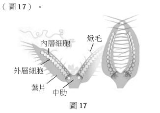 【第40-43題組】捕蠅草捕蟲的趣事是生物適應的現象之一。捕蠅草生長在養分及礦物質缺乏的溼地,為了生存,它演化出肉食性的特質。它的葉片特化成捕器,是可以吸引、捕抓及消化小型節肢動物的器官。捕器閉合的物理機制源自於葉片細胞的膨脹與收縮。當水分從內層細胞流入外層細胞時,內層細胞收縮、外層細胞膨脹,因而造成葉片彎曲而閉合(圖17)。