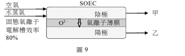 三、丹麥今年啟動了氮氣工業生產的綠色程序,使用固態氣離子電解槽(SOEC),過程中不需要高成本的空氣分離,圖9為其裝置示意圖。將適當比例的空氣和水蒸氣通入陰極,兩者均進行電解,氧氣生成O²⁻,水蒸氣產生H₂和O²⁻。氣離子薄膜只允許氧離子(O²⁻)通過,並在陽極反應。已知SOEC電解水的效率可達80%,在通入莫耳數比為1:3的空氣和水蒸氣後,經電解生成甲和乙兩部分的氣體。甲含有未反應的水蒸氣,將甲通過除水裝置後,直接導入哈柏法製程,即可製造氨。