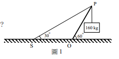 圖1為起重機示意圖,起重機臂 \( PO \) 和水平線的夾角為60°,且可繞O點自由轉動,其質量為200 kg且分布均勻,鋼索PS段和水平線的夾角為30°,\( PSO \) 位於垂直面。起重機臂右端懸掛一質量為160 kg的重物,若此時處於平衡狀態,且整條鋼索質量可忽略不計,則鋼索上的張力是多少N?(取重力加速度 \( g = 10 \text{m/s}^2 \))