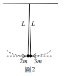 有兩顆大小相同的小球,各以長度為L、質量可忽略不計的擺錘掛在天花板同一點,左邊小球的質量為 \( 2m \),右邊小球的質量為 \( 3m \)。某生拉起兩小球至高度分別為 \( h_L \) 和 \( h_R \),將小球由靜止釋放,讓小球擺向中間,使兩小球恰在最低點時發生正向彈性碰撞,如圖2所示。碰撞後,若左邊的小球擺回到最高點的高度仍然為 \( h_L \),則 \( h_L : h_R \) 為何?