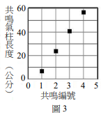 在聲速為350 m/s的環境中,進行音叉與氣柱的共鳴實驗。從零開始,逐漸增加氣柱長度,並將測得共鳴時的氣柱長度,依時間的先後順序編號為1、2、3、4,四次測得之共鳴氣柱長度對編號作圖,如圖3所示。實驗所用的音叉頻率,最接近多少Hz?