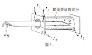 圖4為電流天平的構造示意圖。當U型電路上的電流值為 \( I_1 \)、螺線管所載電流值為 \( I_2 \)、天平左端所掛的小重物質量為 \( m \) 時,天平恰成平衡。若將電流 \( I_1 \) 變成 \(-4I_1\),同時 \( I_2 \) 變成 \(-\frac{1}{2} I_2\)(負號表示電流方向與原來的方向相反),則此時可使天平平衡的小重物質量應為何?(忽略地磁造成的影響:g為重力加速度,L為U型電路寬度,B為螺線管所產生的磁場)