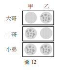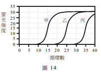二、即時聚合酶連鎖反應(Real-time PCR)是在 DNA 擴增反應過程,以螢光染劑與擴增的 DNA 進行結合,整個 PCR 反應過程會搭配即時螢光偵測來判斷目標 DNA 片段含量多寡的技術。判讀即時聚合酶連鎖反應的數據是需先設定螢光閾值(threshold),超過此閾值代表有訊號出現,而超過閾值時的 PCR 循環數數目就稱之為 Ct(Cycle threshold; Ct)值,由 Ct 值可推算病毒/病毒核酸濃度高低,例如 Ct 值 17 表示病毒核酸要擴增為原來的 2^17 倍才能被偵測到。某研究員取相同量的樣本甲~丙,利用 Real-time PCR 進行新冠病毒篩檢,螢光閾值設為 15,所得訊號如圖 14 所示,回答下列問題。