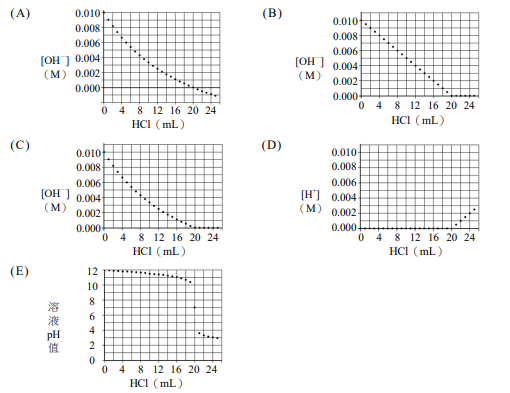 某生以 0.010 M 的 HCl 溶液與 20.0 毫升 0.010 M 的 NaOH 溶液進行反應,反應時每次加入 HCl 溶液 1.0 毫升,總計加入 25 次。若將燒杯內 [OH^-]、[H^+] 與 pH 值和加入的 HCl 體積作圖,試問下列五個圖中,哪些正確?(注意各圖的縱座標)