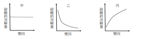碳酸鈣固體溶於水為一放熱反應。下列甲、乙、丙三種圖形分別代表碳酸鈣固體在水中溶解量與施加變因的關係圖。下列相關變因的敘述,哪些正確?