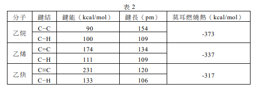 表2 比較乙烷、乙烯、乙炔三者的莫耳燃燒熱和碳-碳鍵、碳-氫鍵的鍵能和鍵長。