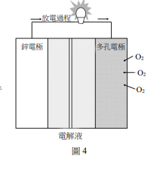 二次電池與我們的日常生活息息相關,鋰離子電池便是一例。近年來科學家開始發展一種同時具備金屬離子電池與燃料電池優點的二次電池,以鉑-空氣電池(圖4)為例,放電時電極反應如式3和式4所示: