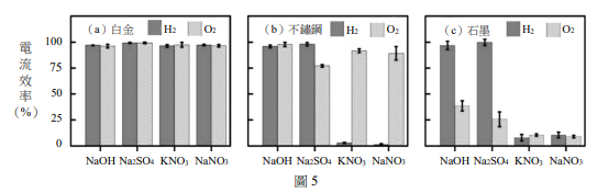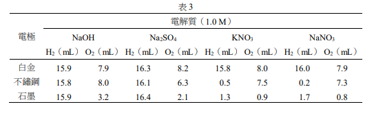 水電解反應所產生的氫氣(H2)與氧氣(O2),可分別作為燃料與醫療用途。為了瞭解電解質與電極材料對於水電解反應的影響,小安利用NaOH、Na2SO4、KNO3 與NaNO3 作為電解質,搭配白金、不鏽鋼與石墨作為電極,設計了一系列水電解實驗,並將結果整理成表3 與圖5;表3 為水電解實驗氣體生成體積,圖5 為水電解實驗的電流效率。電流效率表示所流通的電流中,有多少比例實際進行水電解反應。