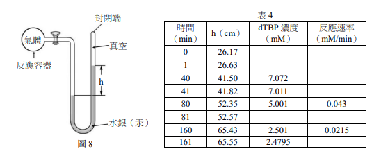 為了研究此一反應,小明在420 K下將一定量的dTBP氣體注入如圖8的反應容器中,並觀察水銀(汞)柱高度(h)隨時間的變化,紀錄如表4。小明也在表4中填寫了部分實驗數據分析的結果,但內容並不完整。假設容器中一開始只有dTBP且整個反應過程容器中只有式5所列之三種氣體存在,依據表4回答下列問題:(註:1.水銀壓力計內的體積變化可忽略不計,2.要寫出計算過程,否則不予計分)