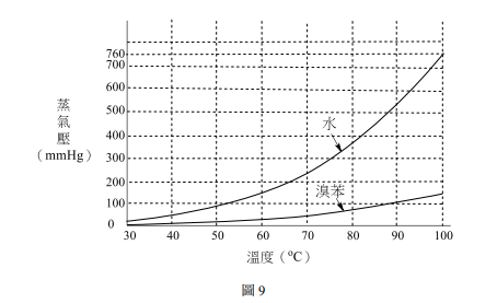 蒸氣蒸餾是一種提取植物精油常用的方法。此法乃將水與不溶於水的有機物質混合後,於蒸餾裝置中直接加熱至沸騰而將有機物質與水一起餾出,待觀察冷凝管中冷凝的液體不再有油滴存在時,表示蒸餾結束。已知溴苯(C6H5Br,分子量=157)不溶於水,其沸點於常壓(760 mmHg)為156℃,且水與溴苯在不同溫度時的蒸氣壓如圖9 所示。理論上,兩種不互溶的液體,其蒸氣壓的表現,直接對應於該溫度之個別蒸氣壓。今將50 克水與20 克溴苯混合並加熱,回答下列問題:(註:要寫出計算過程,否則不予計分)