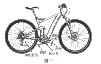 ◎一台具有三段變速系統的腳踏車(如圖10),其前齒盤的齒數為38齒,後齒盤組有相同轉軸但齒數分別為14、19與26齒的3個齒盤。鍵條套在前齒盤和後齒盤上,當前齒盤轉動1齒,後齒輪盤也跟著轉動1齒;且齒盤齒數與齒盤半徑成正比。