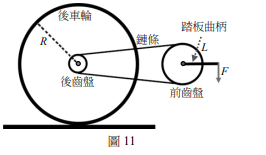 25 圖11為腳踏車驅動過程的示意圖:(i)騎士對踏板施力,經長度L的踏板曲柄對前齒盤的轉軸產生力矩;(ii)使前齒盤轉動並施力於鏈條上;(iii)鏈條上的力傳遞至後齒盤,使後齒盤轉動;(iv)後齒盤轉動時,施力於後輪使其轉動;(v)後輪與地面接觸點相對於地面靜止,地面施一反作用力於後輪,使腳踏車前進。若將腳踏車簡化為一質點,則下列有關腳踏車驅動過程的敘述哪些正確?(多選)(5分)