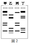 某警察利用PCR技術分析刑案現場DNA樣本甲,以及嫌疑人之、丙、丁的血液DNA樣本。四樣本的PCR產物分別以同一膠體進行電泳結果如圖2,黑色條帶為產物在膠片上的訊號,產物分子量越大泳動越慢,條帶會位於膠片較高位置。下列推論何者正確?