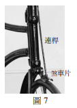 ◎某舊式腳踏車使用的「湯匙煞車」系統是在兩輪胎上方加上一個像湯匙的煞車片,如圖7所示。