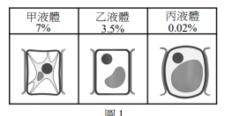 某生進行生態訪查,採集到某一樣本,將其細胞放入含有不同鹽濃度的甲到丙液體中,觀察其變化,如附圖所示。對照附表不同地區之鹽濃度後,某生最有可能採集到下列哪個物種?