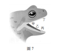 青蛙舌根位於下顎前端(丙處),與人類不同,利於翻出捕食。