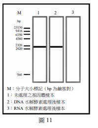 RNA水解酵素處理後條帶消失,DNA水解酵素處理後條帶仍在,顯示基因體為RNA。
