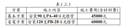 | 省電方案 | 安裝 120 支 PB-28 型燈管 | 60000 元 |