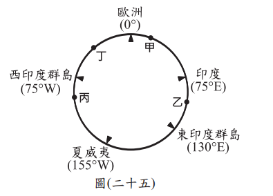 十五世紀開始,許多歐洲探險家出海探尋通往亞洲的新航路。圖(二十五)是十五世紀至十八世紀部分歐洲探險家到達地區的示意圖,其標示方式僅依照這些地區的經度位置排列,而未考慮其緯度位置。狄亞士在1487至1488年的探險旅程中到達某洲的最南端,若要在圖中呈現,應標示於何處?Image