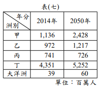 Posted in 會考109社會 會考社會109會考社會試題_33 表(七)為2014年及預測2050年各洲的人口數,根據其變化趨勢判斷,丙最可能為下列何者? (A)歐洲 (B)非洲 (C)美洲 (D)亞洲 [單選題] 答案 (A) 題目與答案 加入最愛清單 加最愛